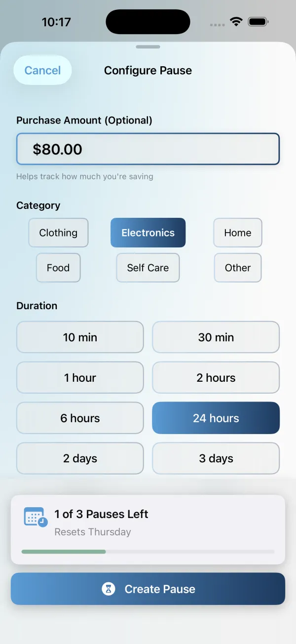 That $80 impulse? Set a 24-hour pause. A timer runs on your lock screen. Most urges don't survive the wait.